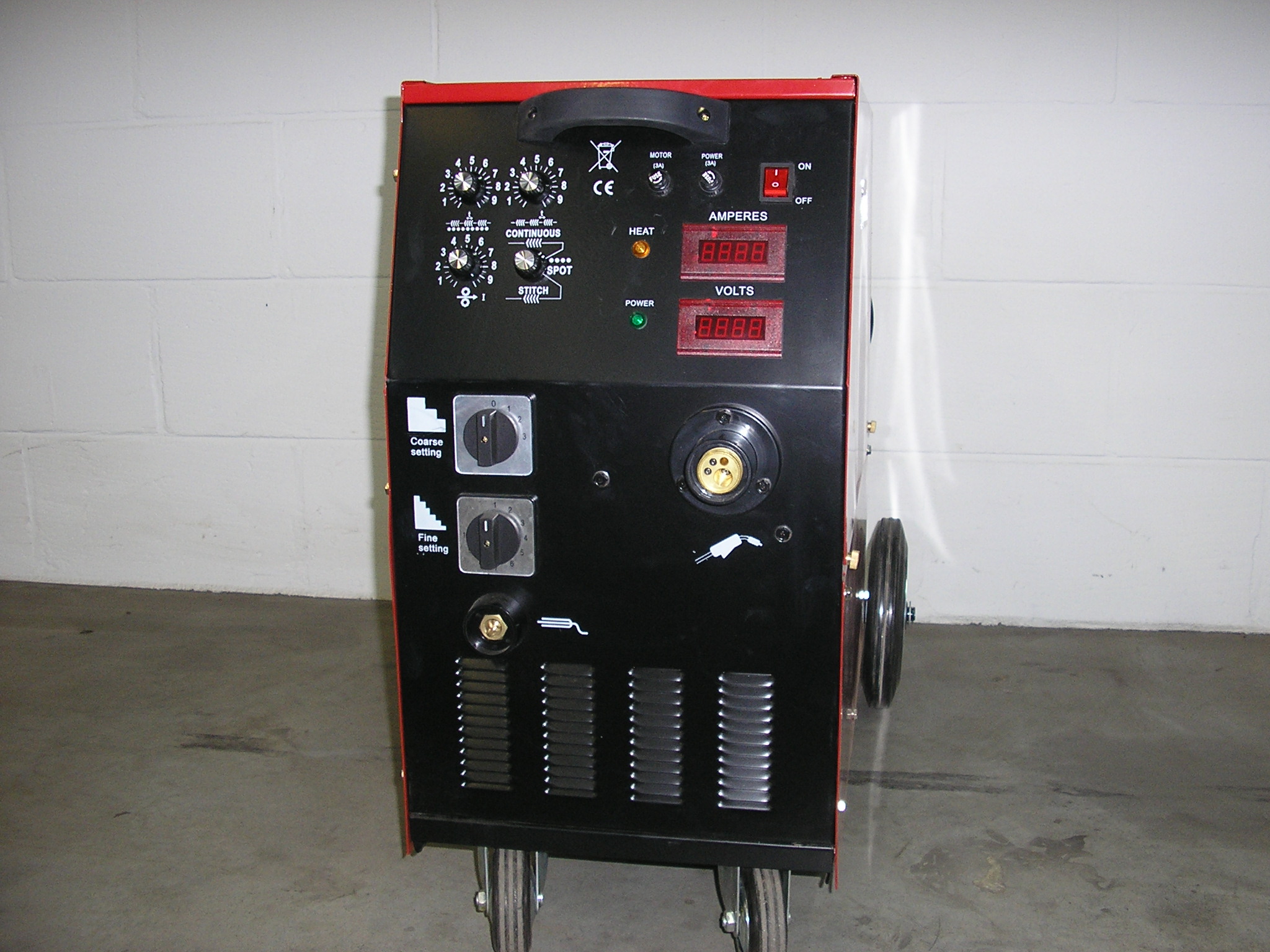 Dit toestel is voorzien van : digitaal volt/amperemeterset, traploos instelbare spotwelding ( puntlastijd), traploos instelbaar interval lassen, schakelaar 3 stappen en schakelaar 10 stappen ( dus totaal 3x10 = 30 stappen ) voor de instelling van de lasstroom en traploos instelbare draadsnelheid.