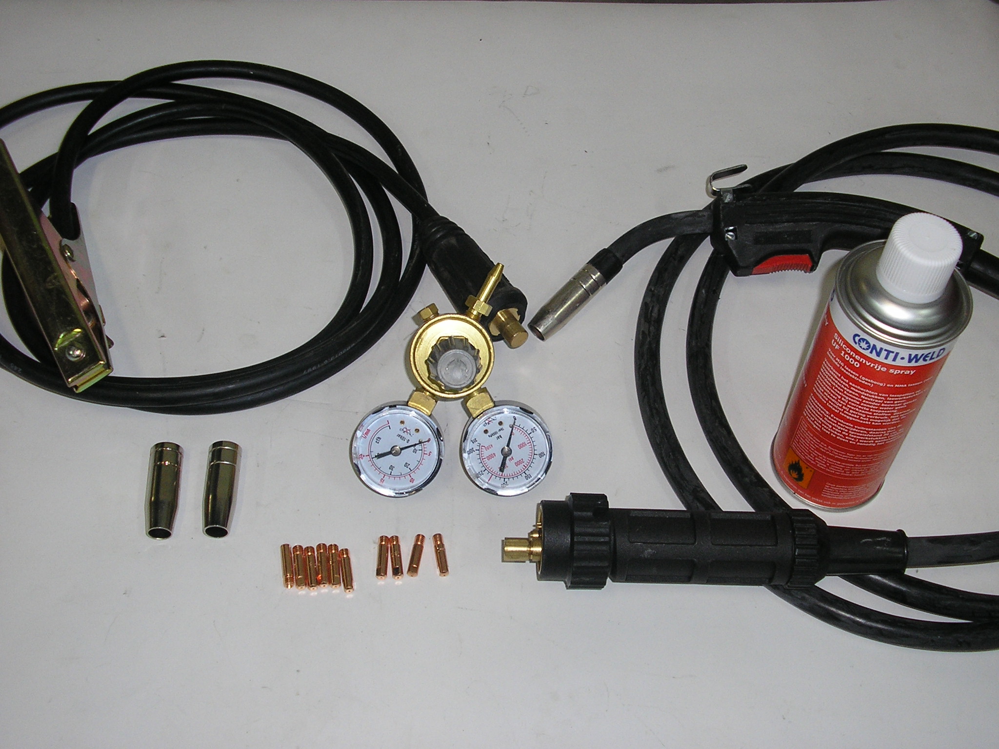 lastoorts, reduceerventiel, aardkabel , rol lasdraad, spuitbus antispatspray, 10st reserve contacttips, 2 st reserve gasmondstuk en de gewenste stekker.
